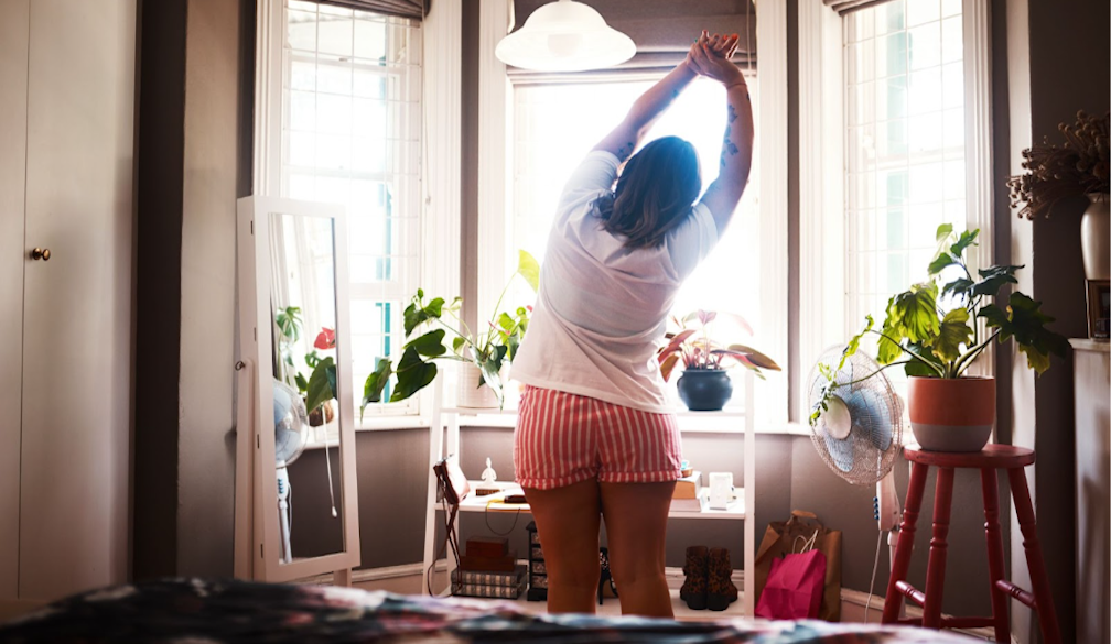 Try out a sunrise alarm clock, which can help you wake up with the sun, no matter the time of morning. Before getting out of bed, take three slow, deep breaths to centre yourself and drink the water you set out for yourself to start your day with some essential rehydration. For a bit more invigoration first thing in the morning and to help wake up your body, do a few gentle stretches or a short yoga flow.