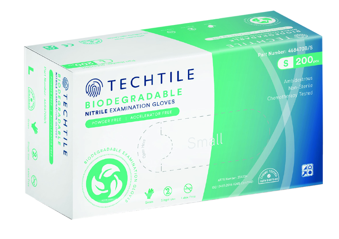 Techtile’s biodegradable nitrile powder-free, non-sterile examination gloves from Aussie Pharma Direct are designed to be eco-friendly without compromising on the chemical, biological and physical protection of the end-user. Made to biodegrade in landfill through a microbial process, the loves do not generate micro plastic after the biodegradation process.